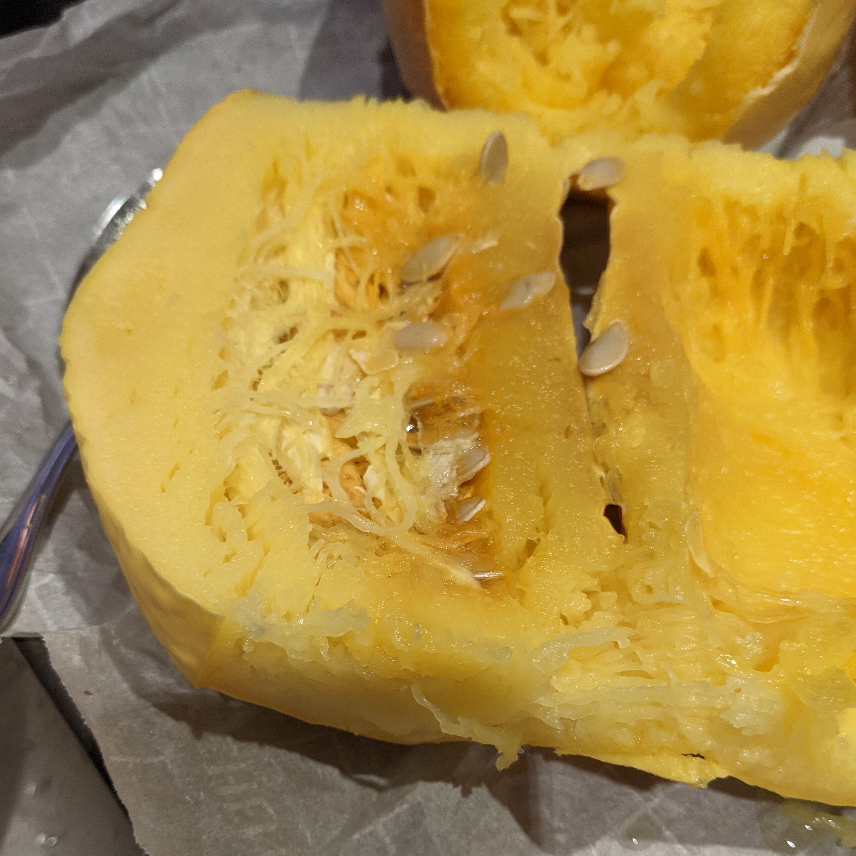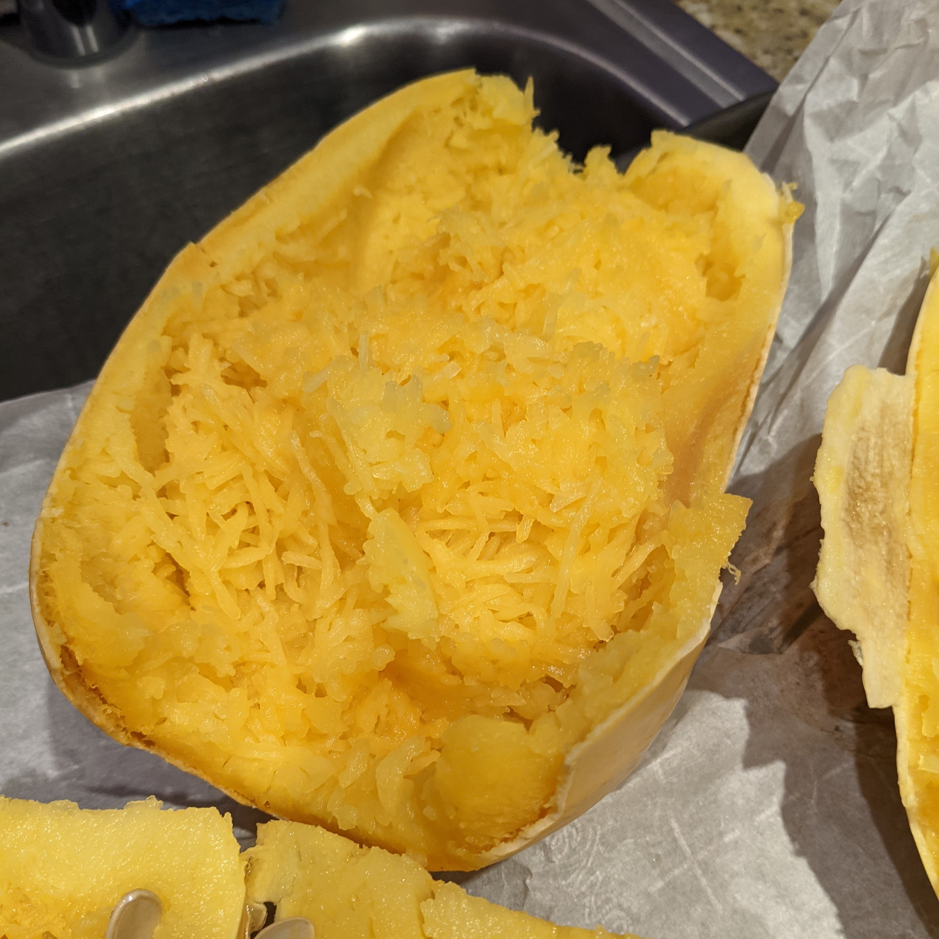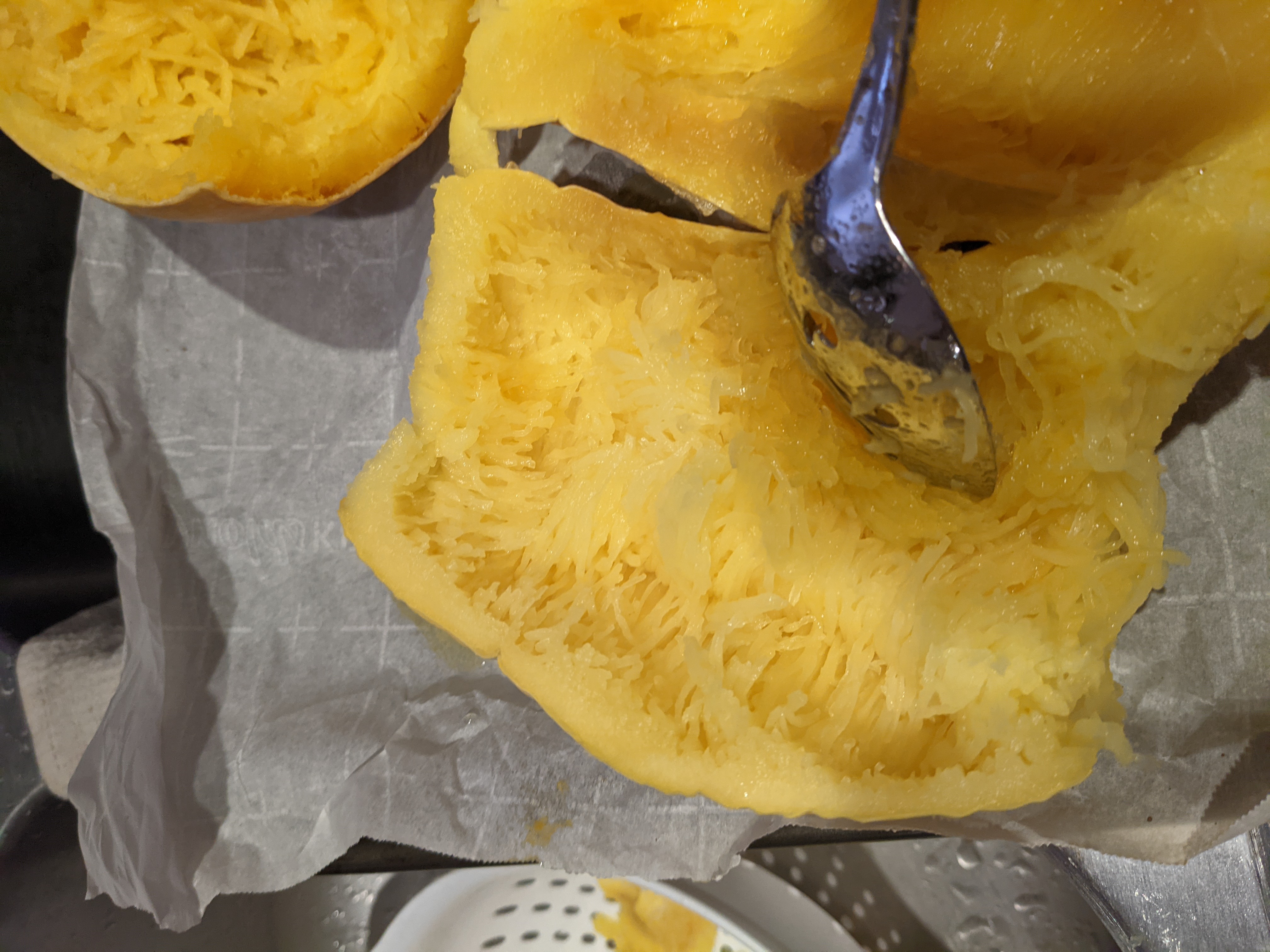 Then go to town with a fork or spoon to “make spaghetti”. This is SO simple – just start scraping and it separates into the spaghetti strands.