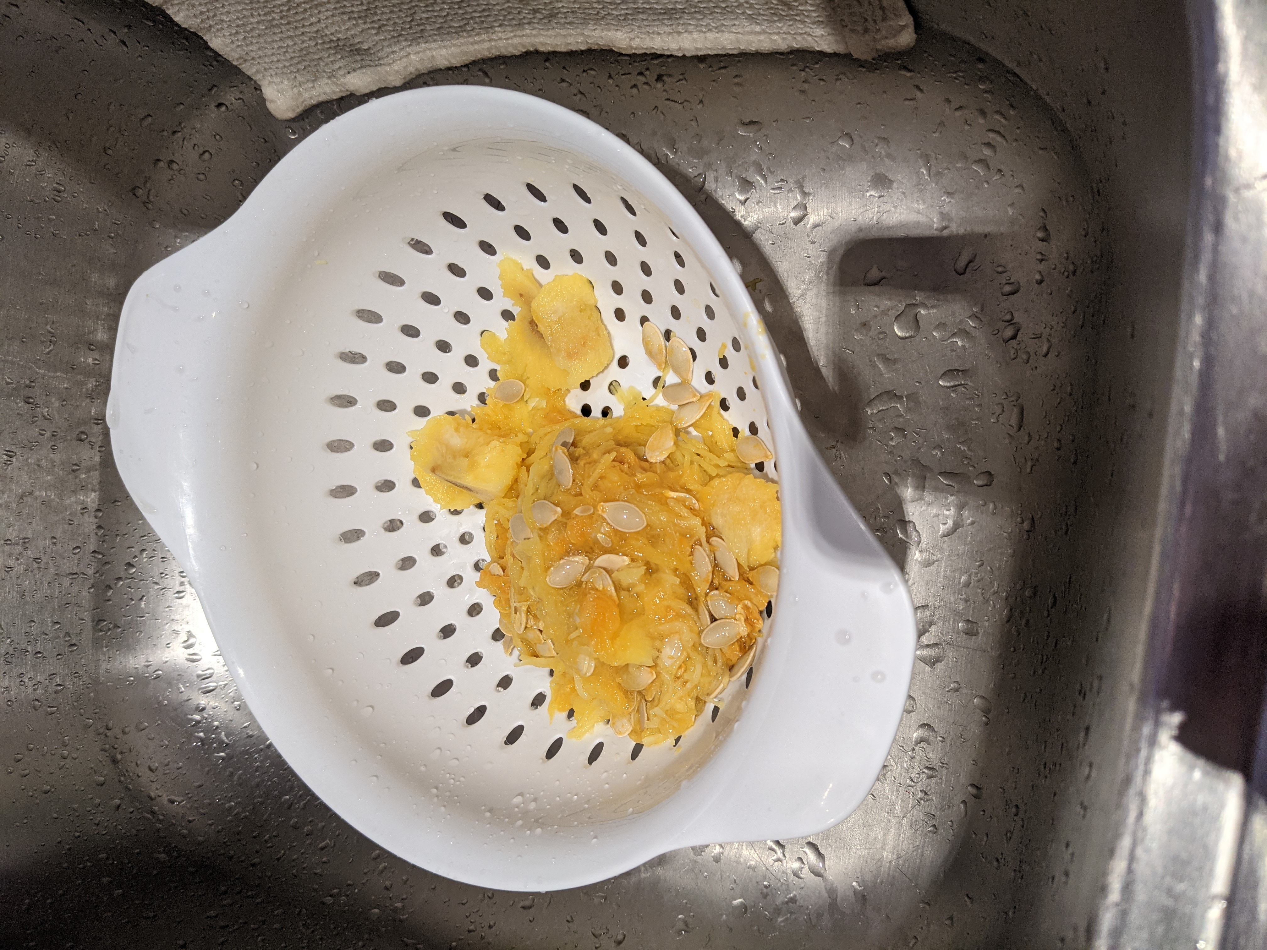 I then scooped out the seeds and put them a separate colander to clean up and sort through to save to see if I can plant them next summer. (I bought my squash at CostCo which usually has organic produce so going to give it a shot at saving the seeds).