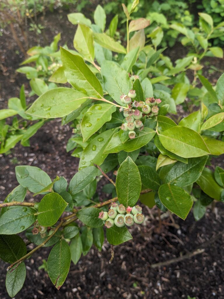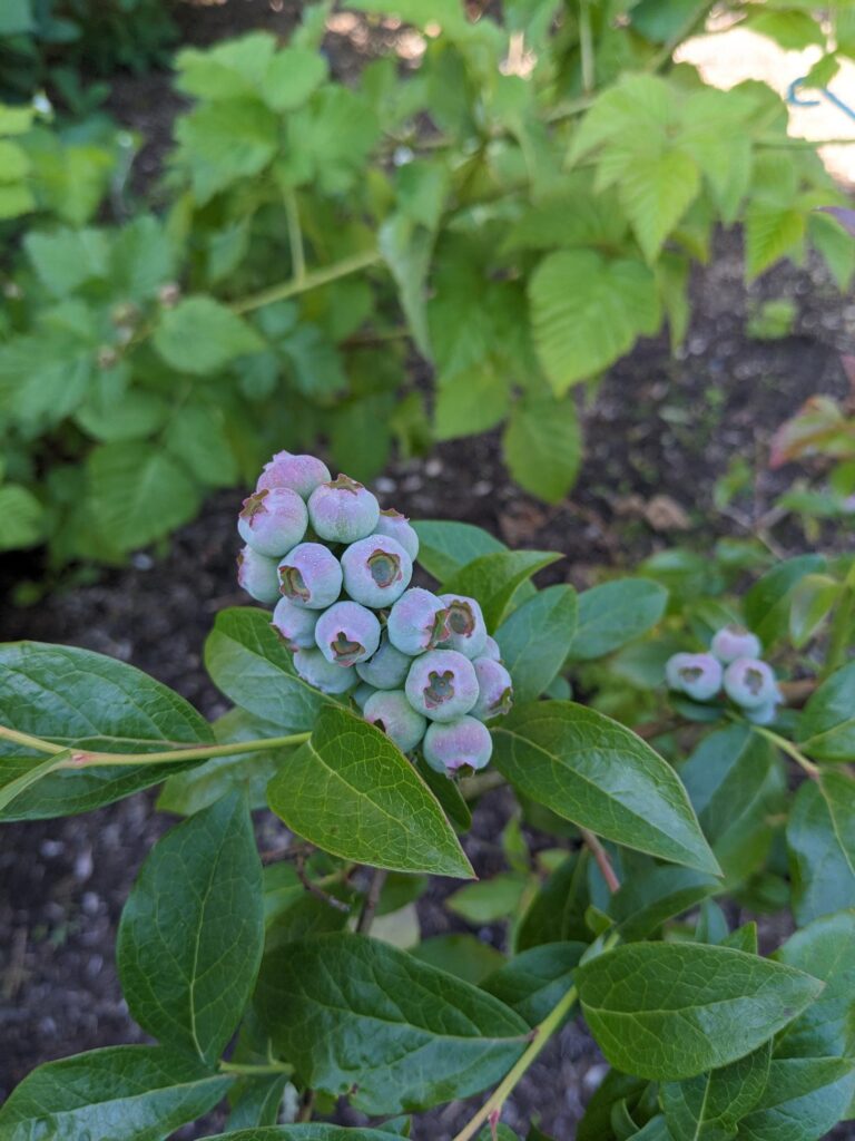 Blueberries, currants, huckleberries, gooseberries and raspberries all seem to be coming in strong. Little green berries are growing, and blossoms are falling off. Thank you, bees!!