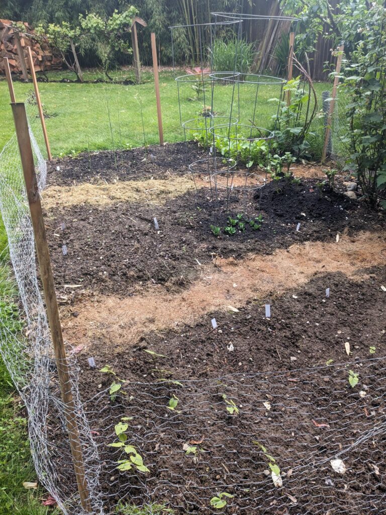 Middle row (L to R): onions and carrots (not growing), peas, potatoes and possibly broccoli & cauliflower on the edges of the potatoes
