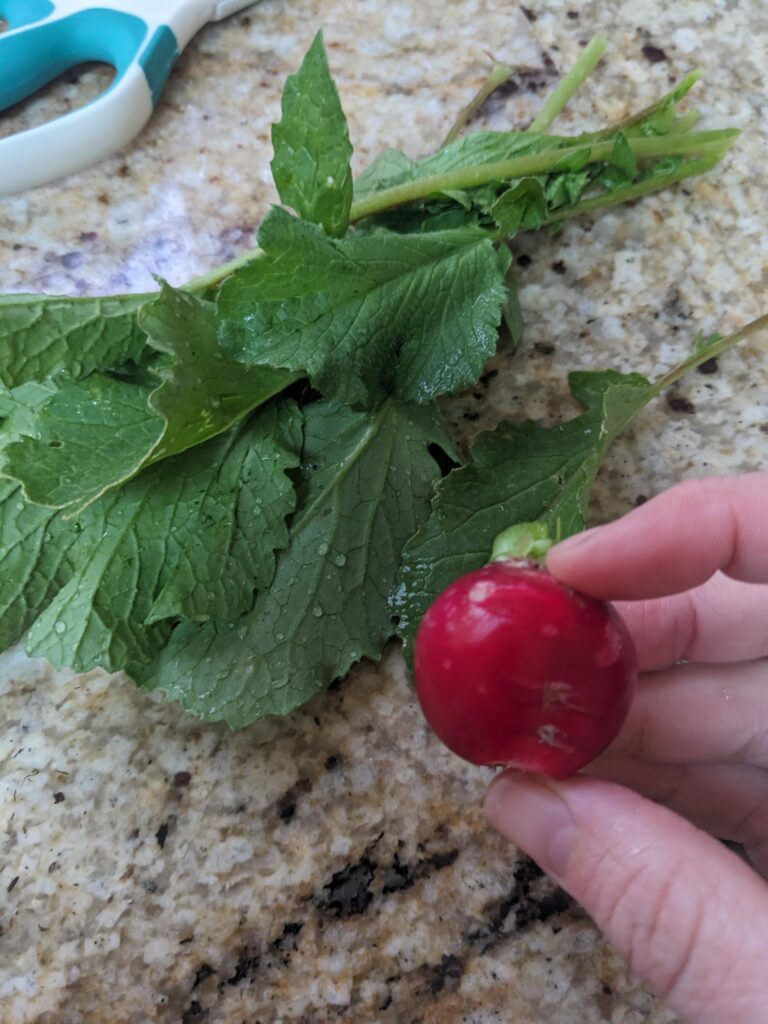 The radishes are coming in well, but so far, the ones I’ve picked have all been split. At first I thought something was eating them, but once harvested, I realized they were split and not bites out of them. I’m also finding that they don’t keep. I’ll need to look into how to keep them, although I’m harvesting 1-2 every few days, so really should just eat them right away.