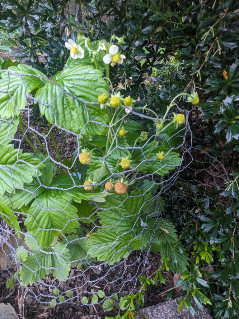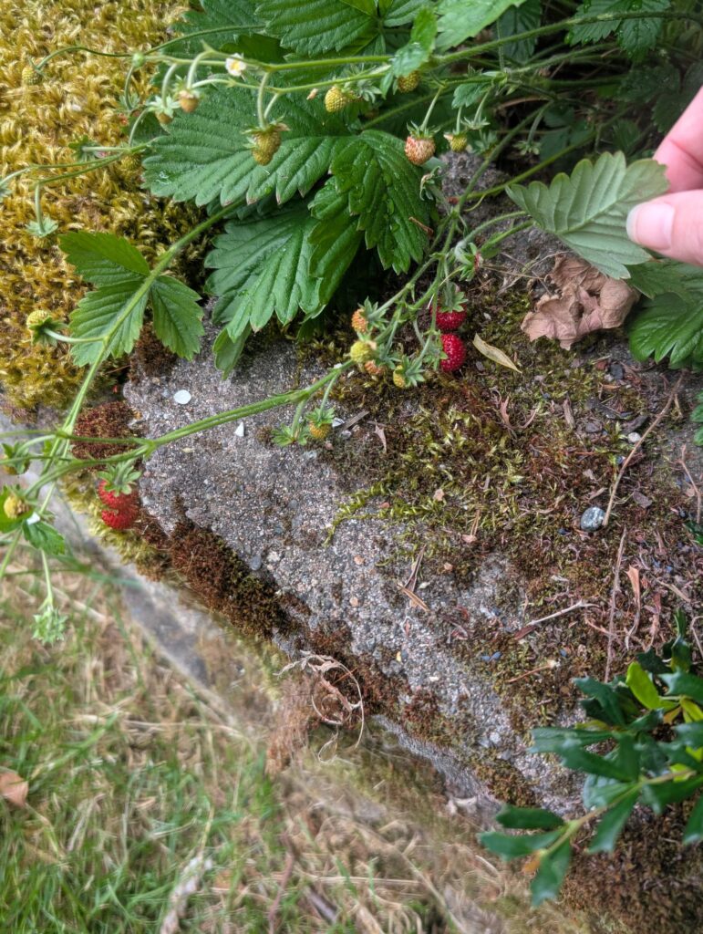 Alpine strawberries are ripening. I took a couple of shoots last year and managed to keep two of them alive over winter. I’ve planted those near the asparagus as they’re supposed to be great companion plants.