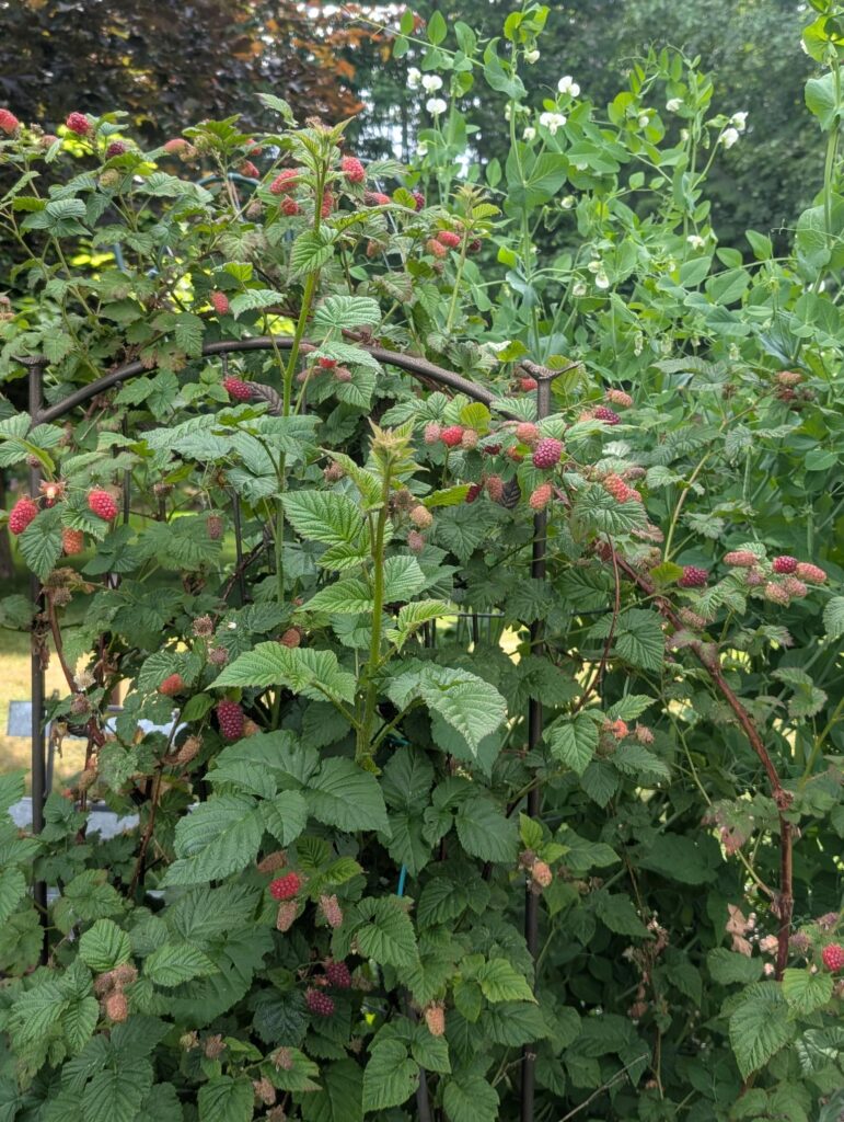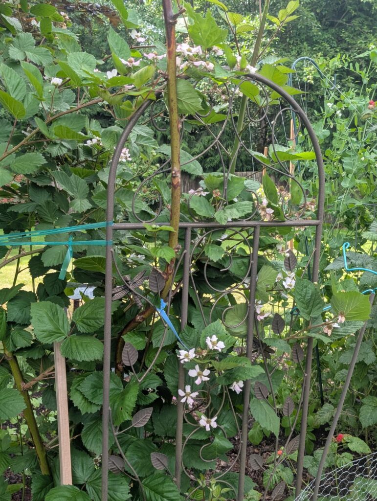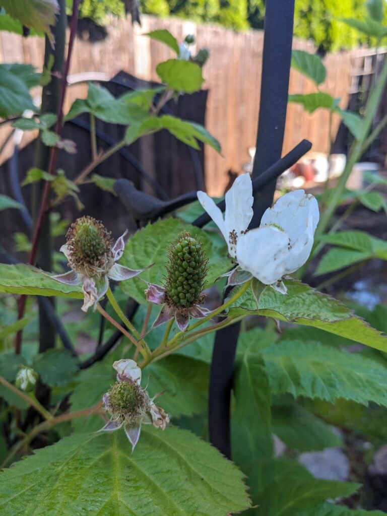 The berries that line one side of the main garden are all doing well. The Logan Berries skipped last year but appear to be a bumper crop this year. Tayberries are already ripening. And the Boysenberry has a lot of blossoms.