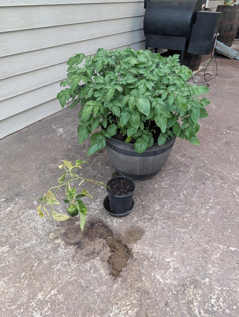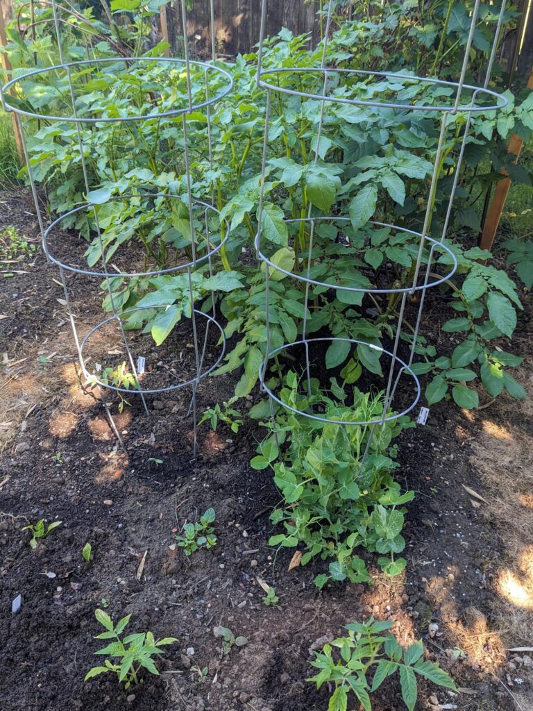 In the main garden, I have a couple of volunteer potatoes. I didn’t buy seed potatoes this year. I had a couple of potatoes from last year that had sprouted. There was also a leftover store-bought organic russet that I used as well. Time will tell how any of those turn out.