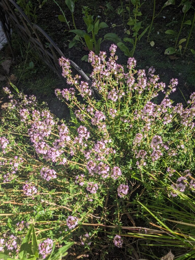 The thyme has blossomed and looks beautiful! I’ll try harvesting some of the stalks that haven’t bloomed to dry for use as spices this fall.