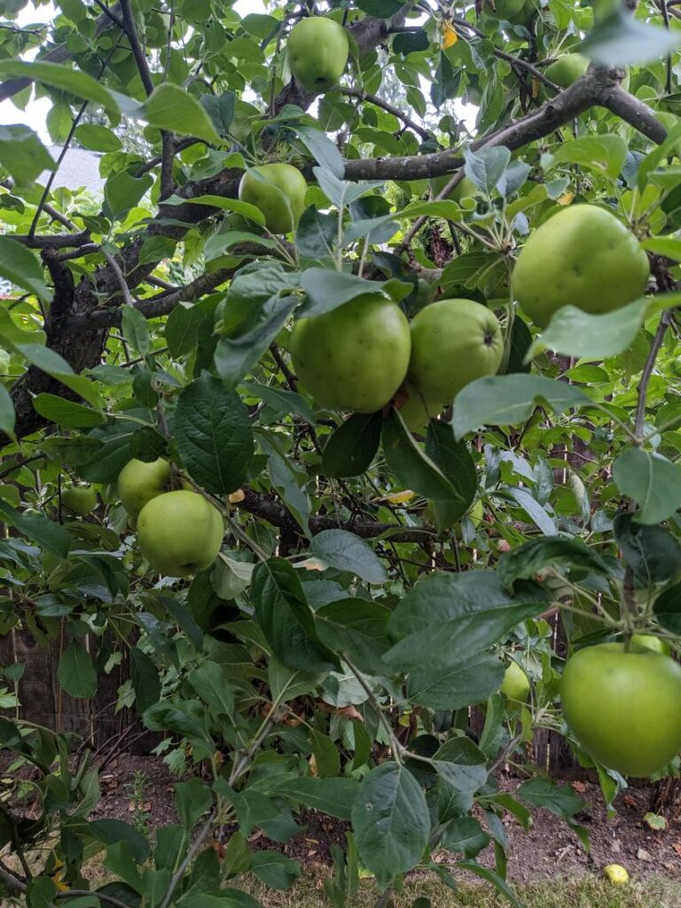 And the apple tree directly behind the garden is FULL of apples….on half the tree. I’m already collecting the apples that have fallen on the ground to use for apple cider vinegar. The apples from this tree go bad fairly quickly if we can even get good ones that aren’t bug infested. Next year, I will try to get some vinegar hung in the branches after they’ve been pollinated to see if that helps keep bugs away.