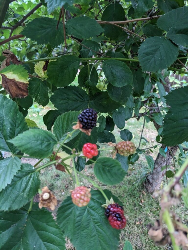 In the rest of the garden on that side of the yard, we have the last remaining summer berry producing. I think it is a Boysen berry, but it doesn’t look like the other Boysen berry plant we have. But, it’s producing really well with a TON of berries on it.