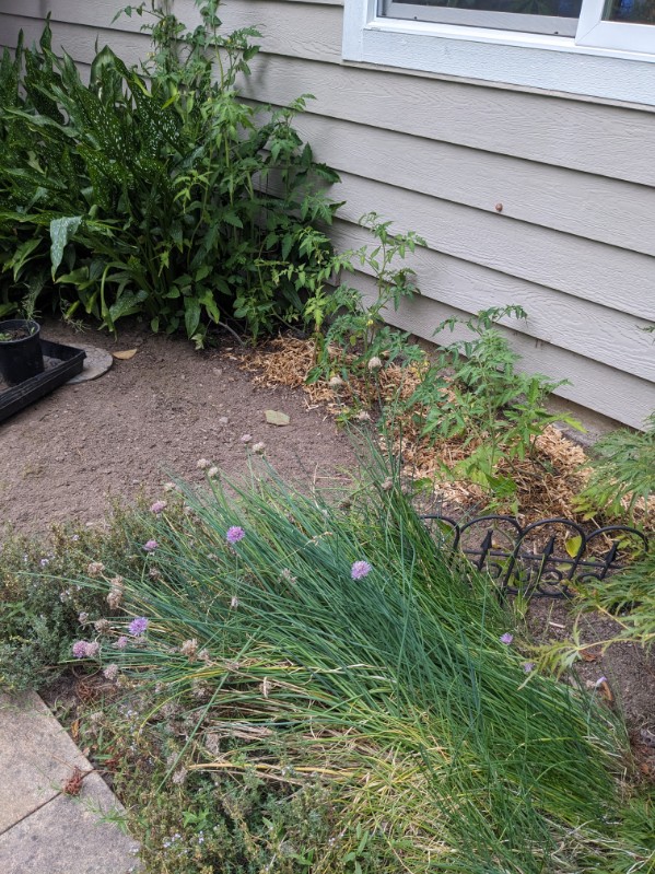 We have another spot that has tomatoes, chives and thyme growing. The chives and thyme have both blossomed, but I haven’t yet harvested them. I’ll try to get a few sprigs of thyme and will dry them. The chives aren’t something I think about grabbing to use, but I need to start. I’ll snip some of those and dry them as well.