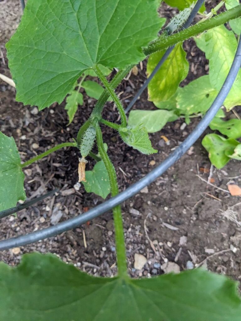 The cucumber that came up was after tossing an old pack of seeds on the grow to see what would happen. ONE grew!! It is actually growing some cukes, but those pictured haven’t really grown in the last couple of weeks. With more watering on the garden, maybe they’ll get to a size that I can actually harvest 2-3 cucumbers.