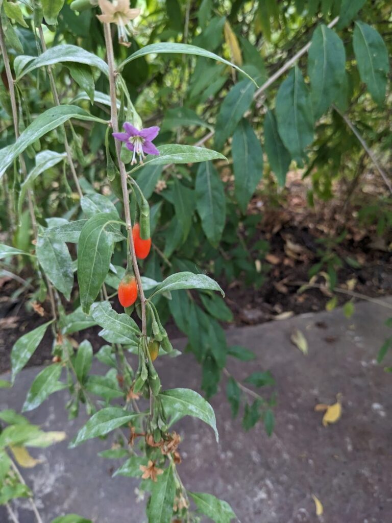 Goji berries are coming in strong for their second harvest of the year. There are a TON of blossoms that are attract the bees and hummingbirds.