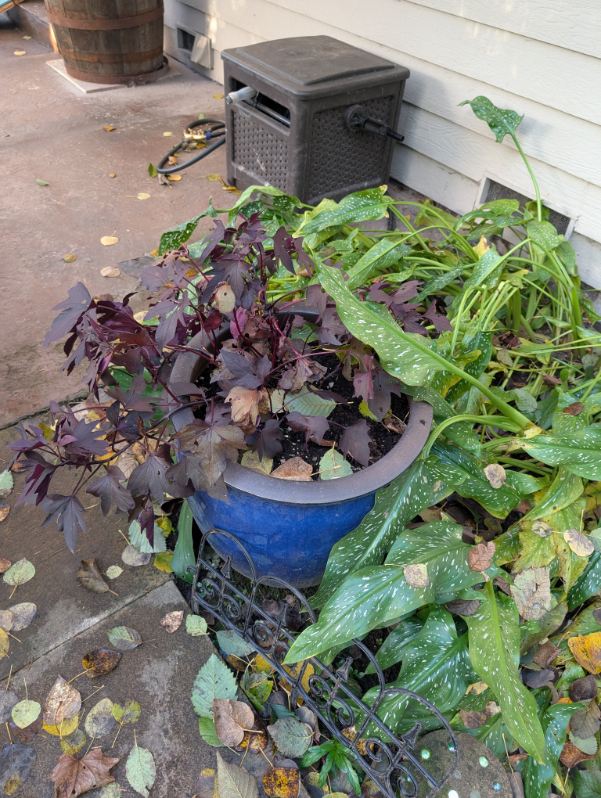 There are still a few things waiting for the first frost which should be any day now. The two types of tubers are dug up after the frost. And the sweet potato will get harvested this weekend frost or not. The leaves on that are starting to die off, so time to dig those up. (or since they’re in a pot, turn the pot over and sort through the dirt)