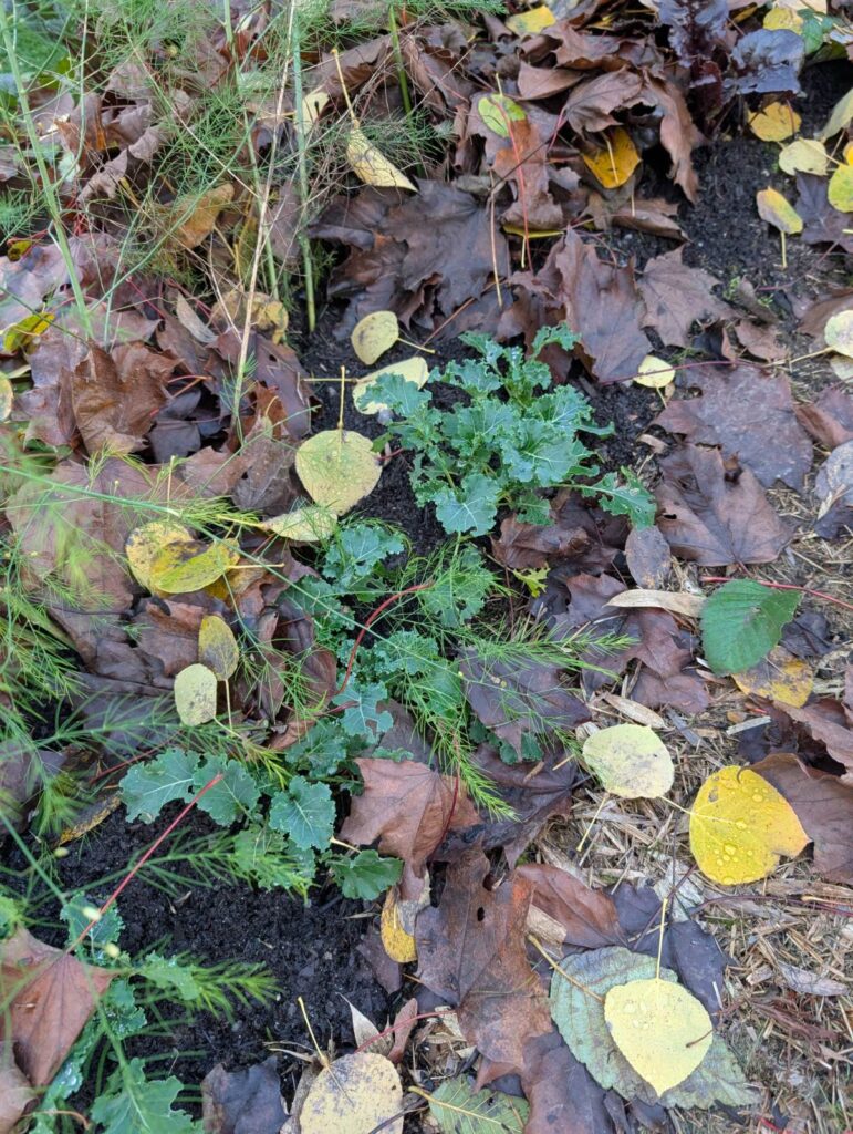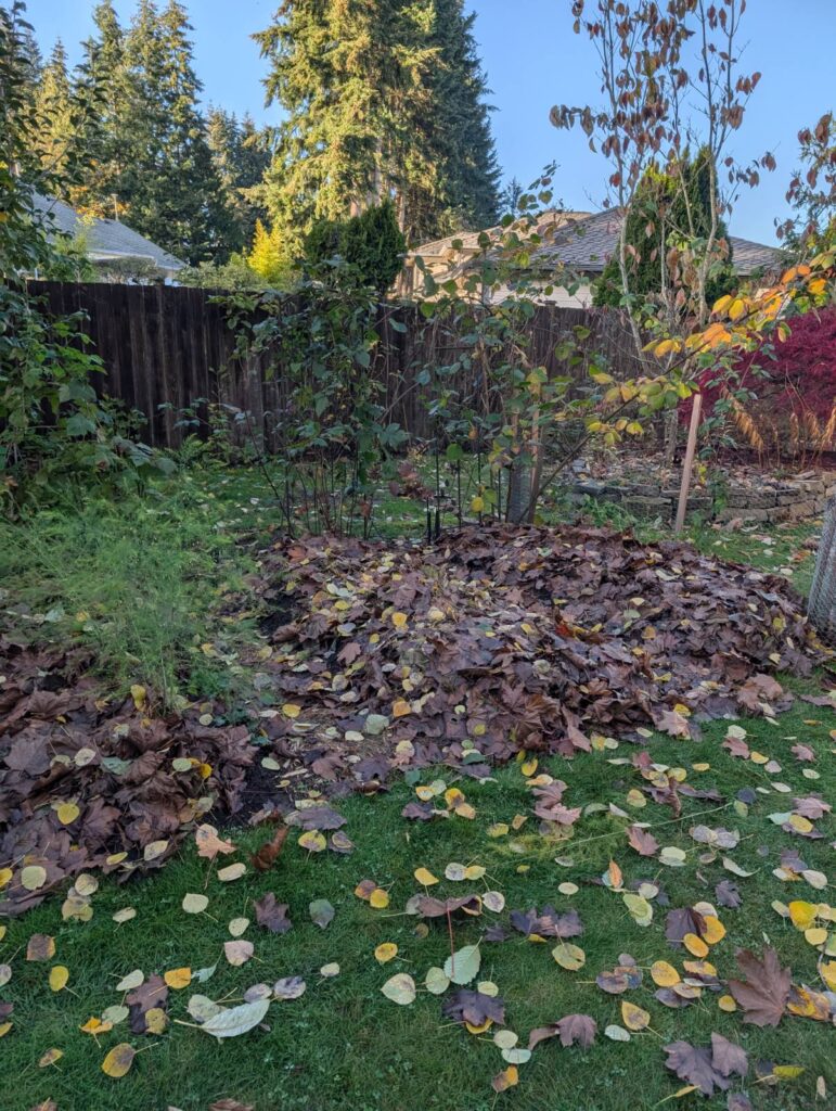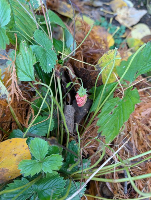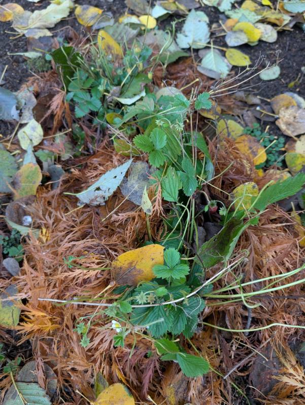 I have also put some leaves around the base of the strawberries (which are also still growing berries, just not ripening) to put those to sleep for the winter. I’ll get a bit more of the Japanese maple leaves and bulk that up this weekend as well.