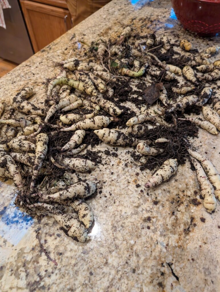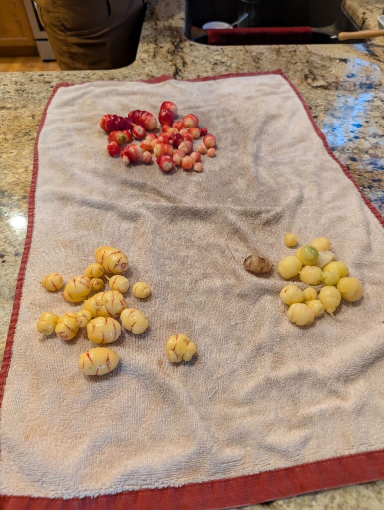 We got a bit over 3/4 of a pound of the Ocas. There are several that he’s keeping in the fridge to use as seed for next year.