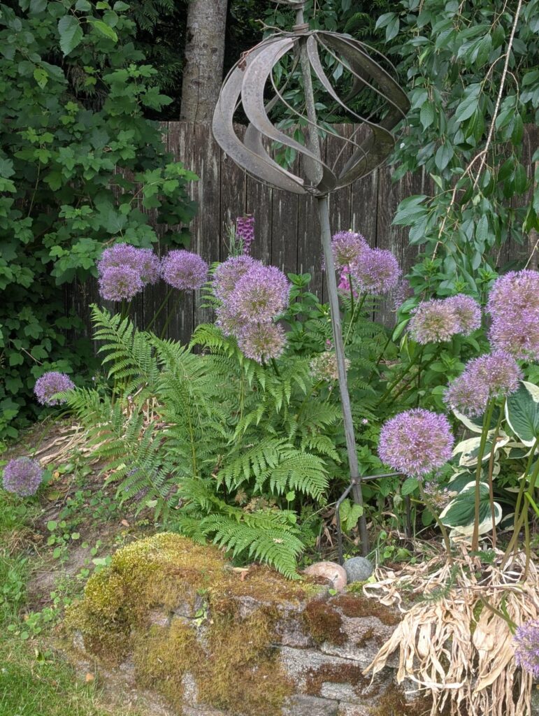 The flowers throughout the yard are beautiful and doing well. The peonies are just about finished up. The allium look gorgeous. And the sedum I planted in the fall from the neighbor are all doing well.